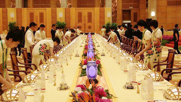 值得一提的是,餐桌中央铺有一条长达34米、印有骆驼图案的黄沙色云锦桌旗,上面摆放着鲜花,寓意为“丝绸之路”上鲜花盛开。在餐桌主位的前方,还有一段约1.2米长、30厘米高用芋头雕刻的“长城”。
