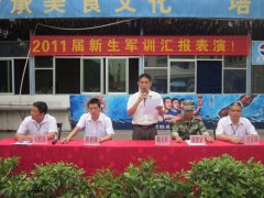 与会领导:司胜东、陈新操、魏兆权、万家国 学生代表谢世敏发表军训感言 8月6日上午,我校在明秀校区隆重举行2011级大厨110(1)班学生军训汇报表演。我校领导魏兆权主任、万家国、司胜东、陈新操、等各部门负责人、